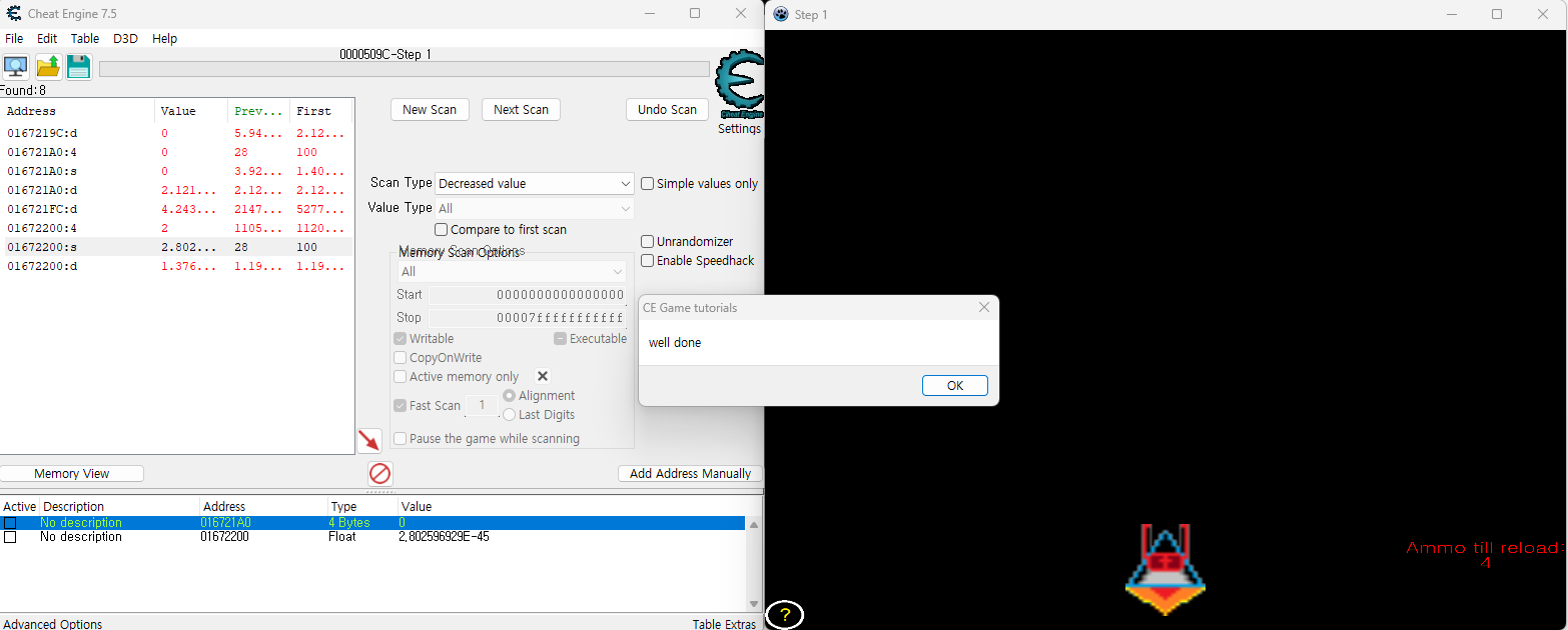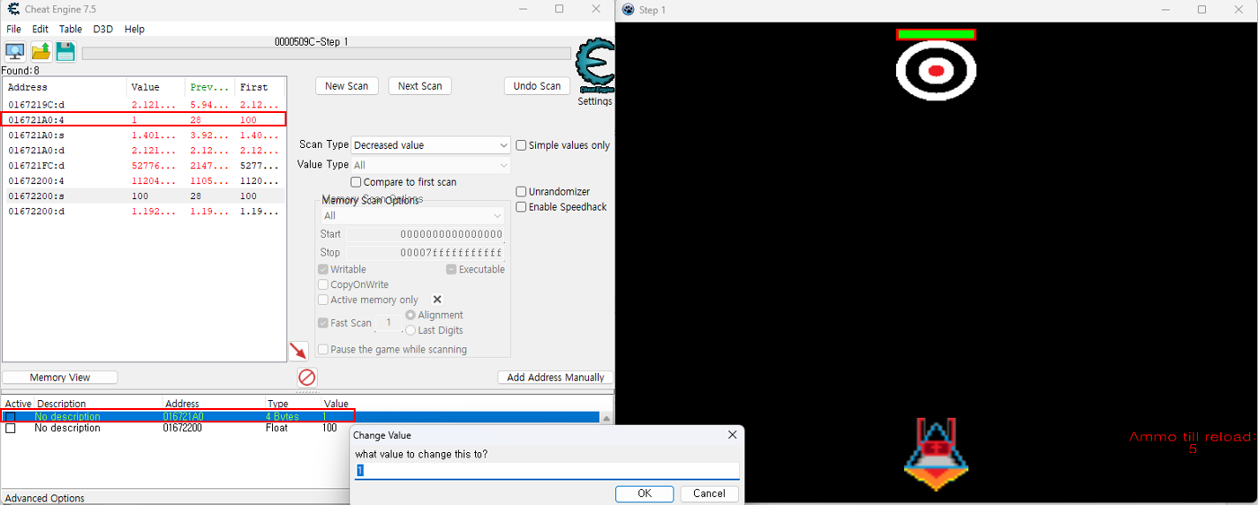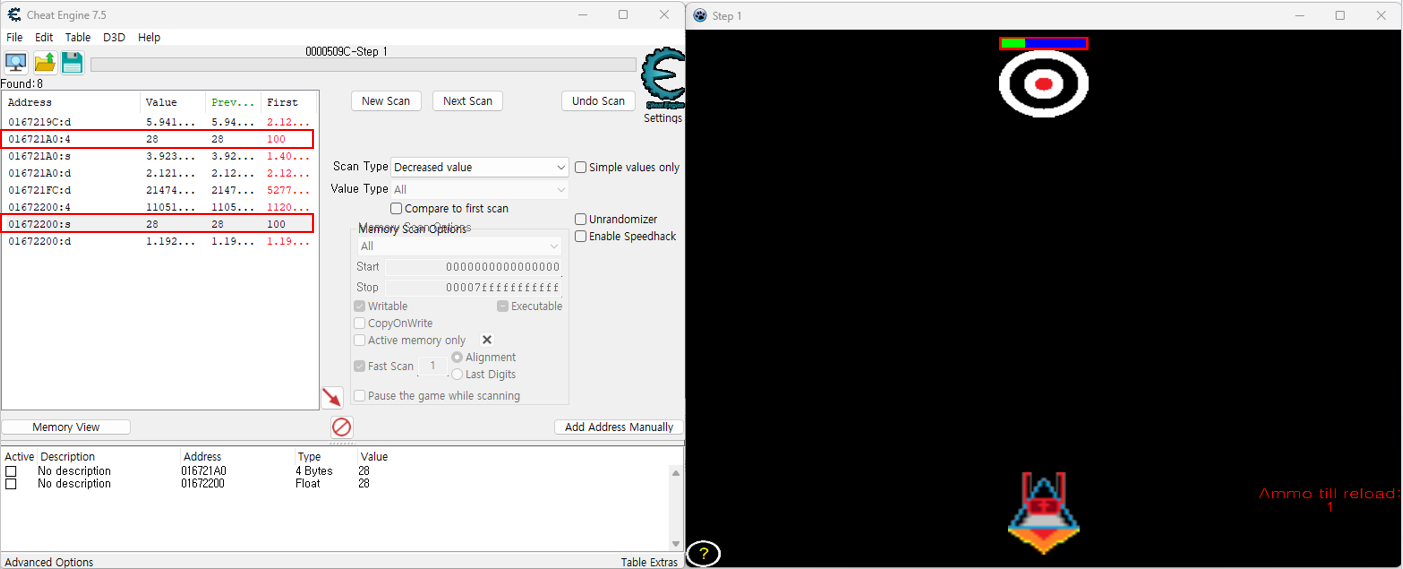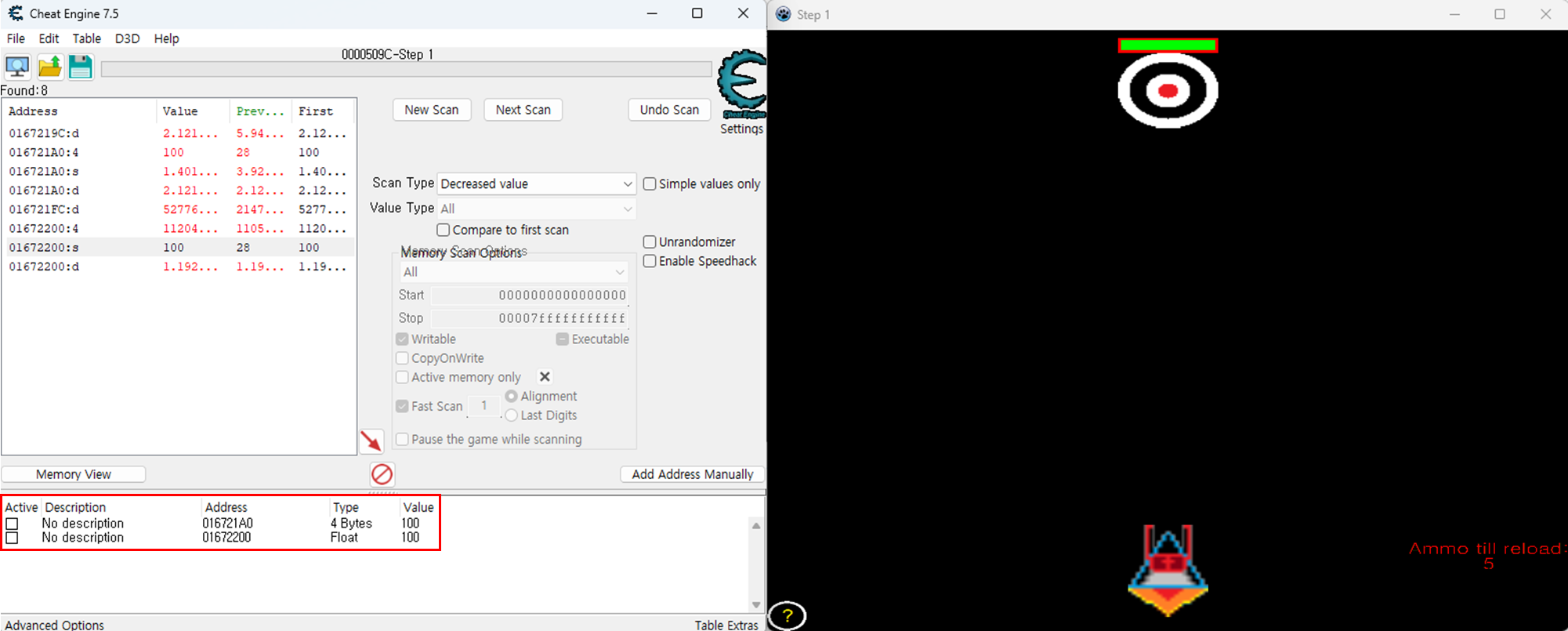 과녁의 체력을 찾기 위해서, Scan Type을 "Decreased value"로 설정하였다. 이후, 총알을 발사하여 과녁의 체력을 감소시킨 뒤 Next Scan을 수행한다.