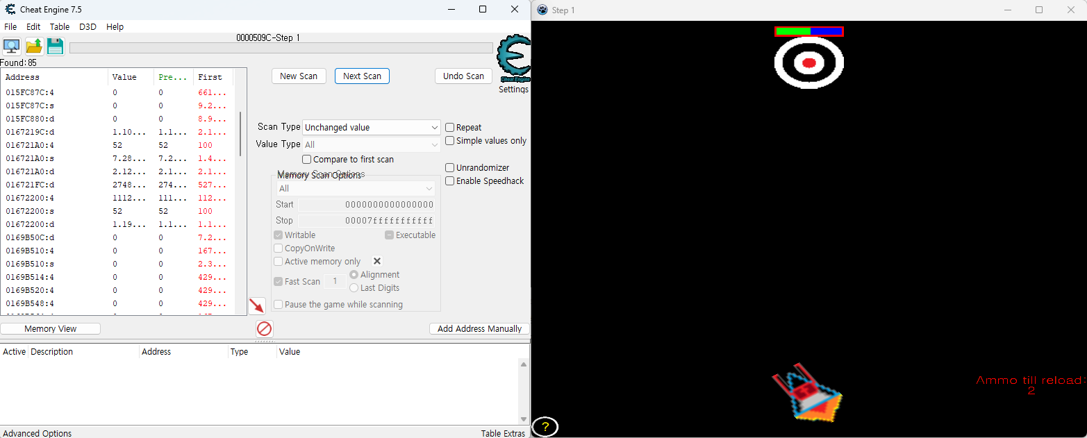 조금 더 Scan 결과 값을 줄이기 위해, 이번에는 과녁을 맞히지 않고, 키보드 방향키를 움직여 총알을 아무 곳에 발사한다. 이후, Cheat Engine 프로그램에서 Scan Type을 "Unchanged value"로 설정하고 Next Scan을 수행한다. 그림 5를 살펴보면, Scan 결과가 훨씬 감소한 것을 볼 수 있다.