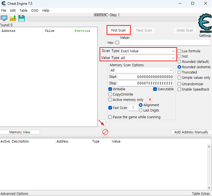 과녁의 체력이 얼마나 선언되어 있는지, 또 그 체력이 어떤 데이터 타입으로 선언되어 있는지 모르기 때문에 Cheat Engine 프로그램에서 Scan Type을 "Unknown inital value", Value Type을 "All"로 설정하여 First Scan을 수행한다.