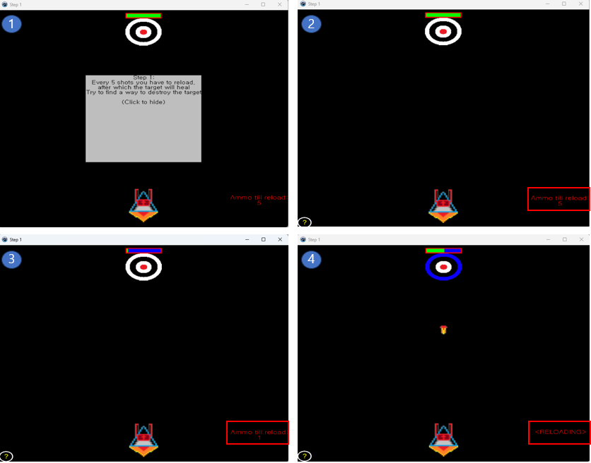 Tutorial Games Level #1은 주어진 총알 5발을 가지고, 과녁을 파괴해야 하는 게임이다. 그림 1의 4번 항목과 같이 마지막 총알 (5 번째 총알)을 과녁에 적중시키려 할 때, 총알이 RELOADING 되면서 과녁의 체력이 다시 채워진다.