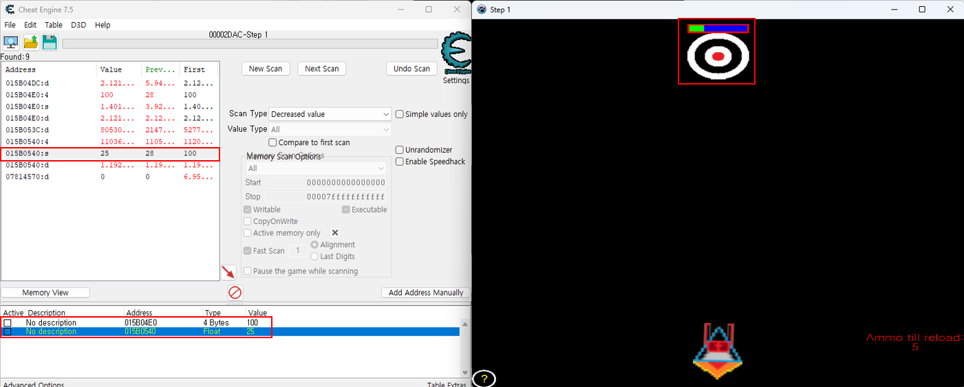 Scan 결과, 그림 6과 같이 과녁의 체력이 감소될 때마다 빨간 박스로 체크된 부분의 값이 지속적으로 변화하였다. 따라서, 해당 두 부분 중 하나가 과녁의 체력이 저장되어 있는 메모리 주소라고 판단하였다.